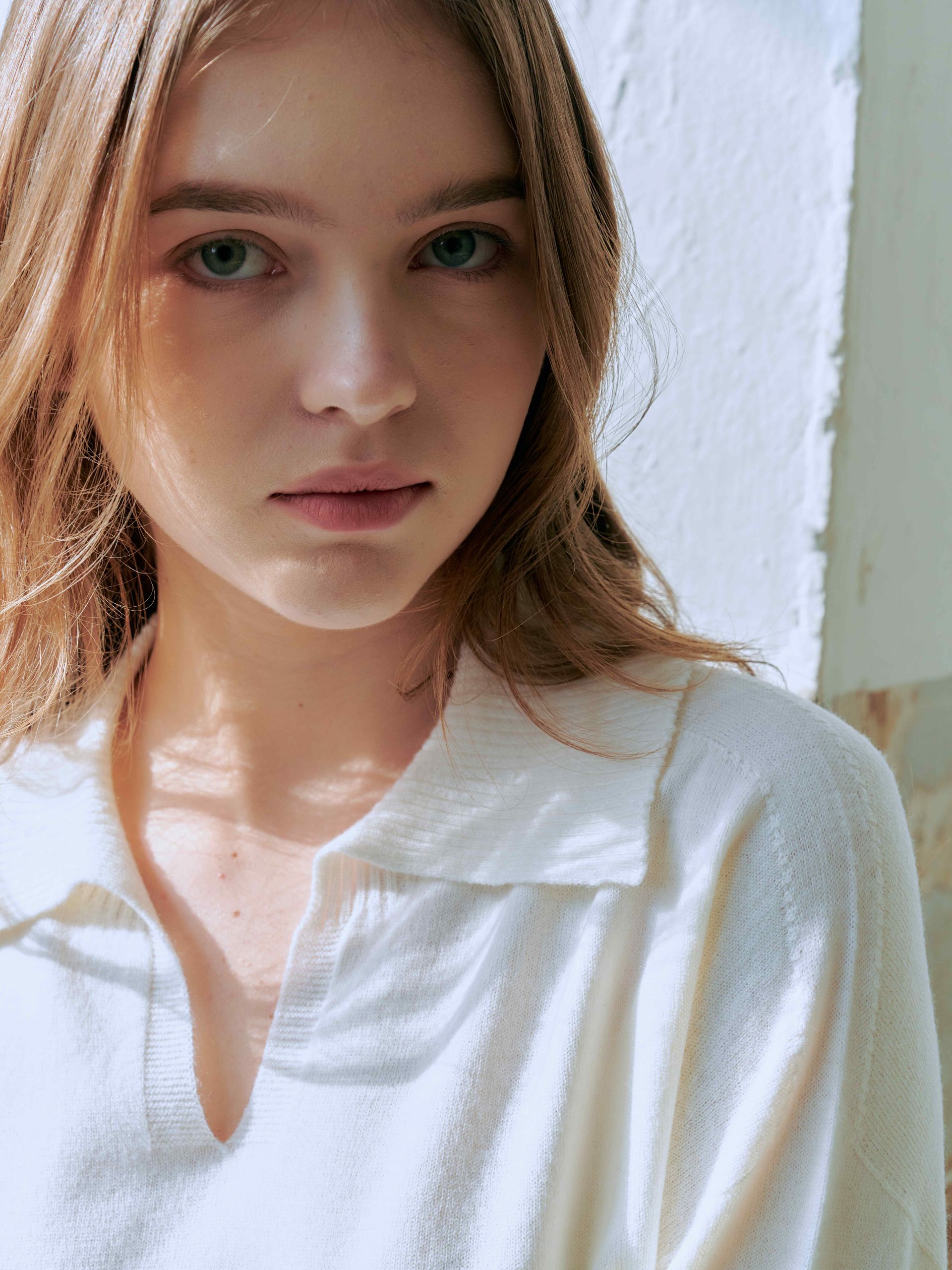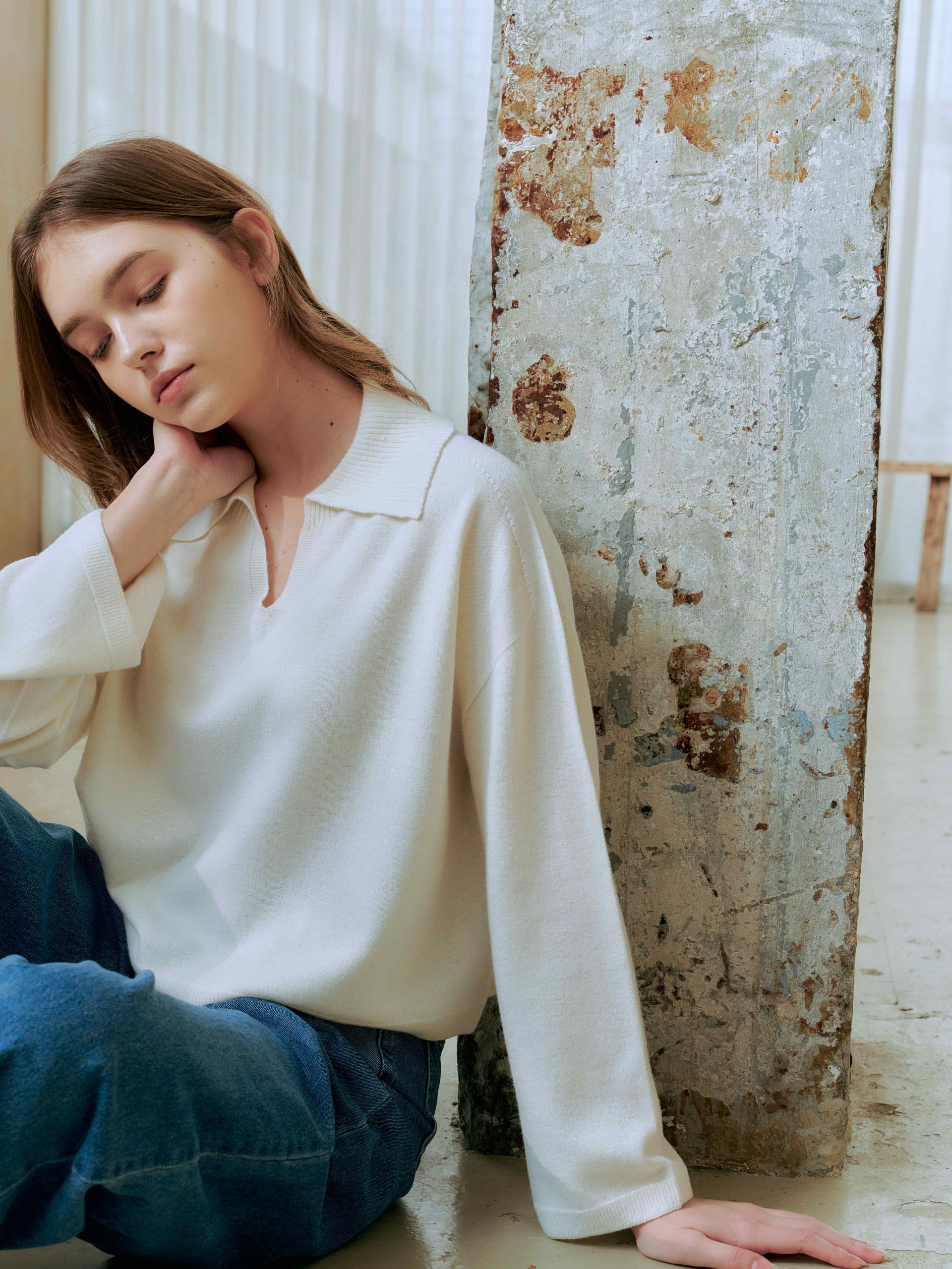 A Buttonless Plain Knit Polo Shirt with a Twist. The oversized collar adds a cute and feminine touch, while the loose and comfortable fit, along with the cropped length, creates a casually chic look.